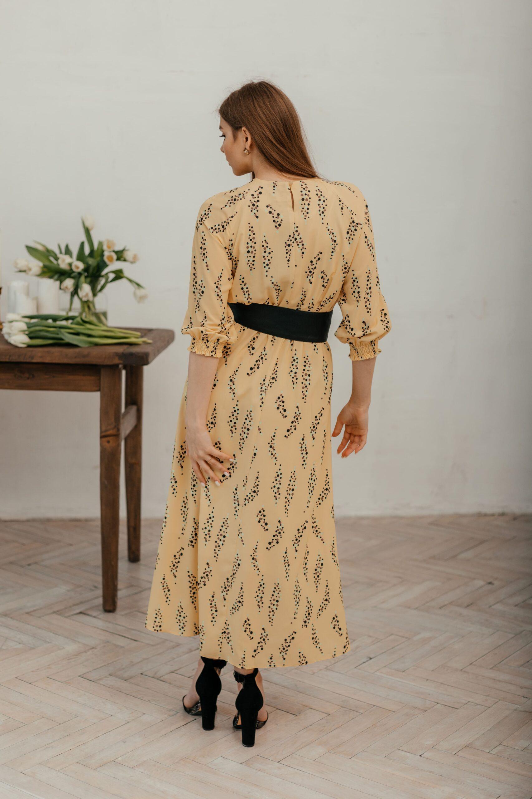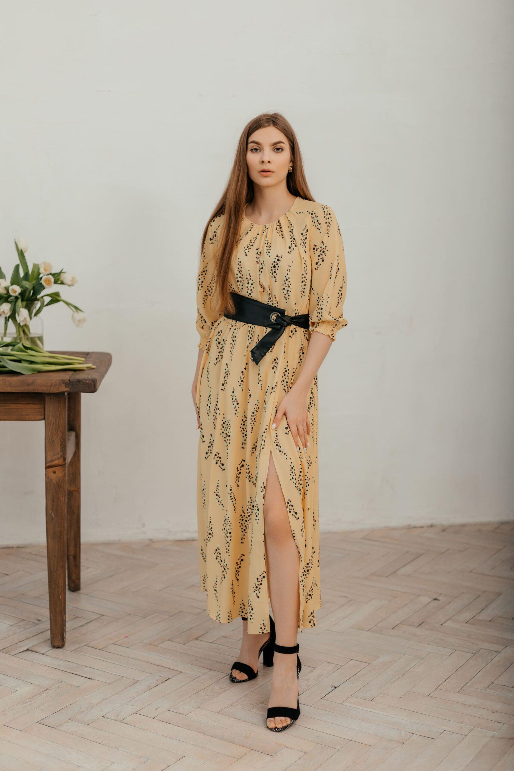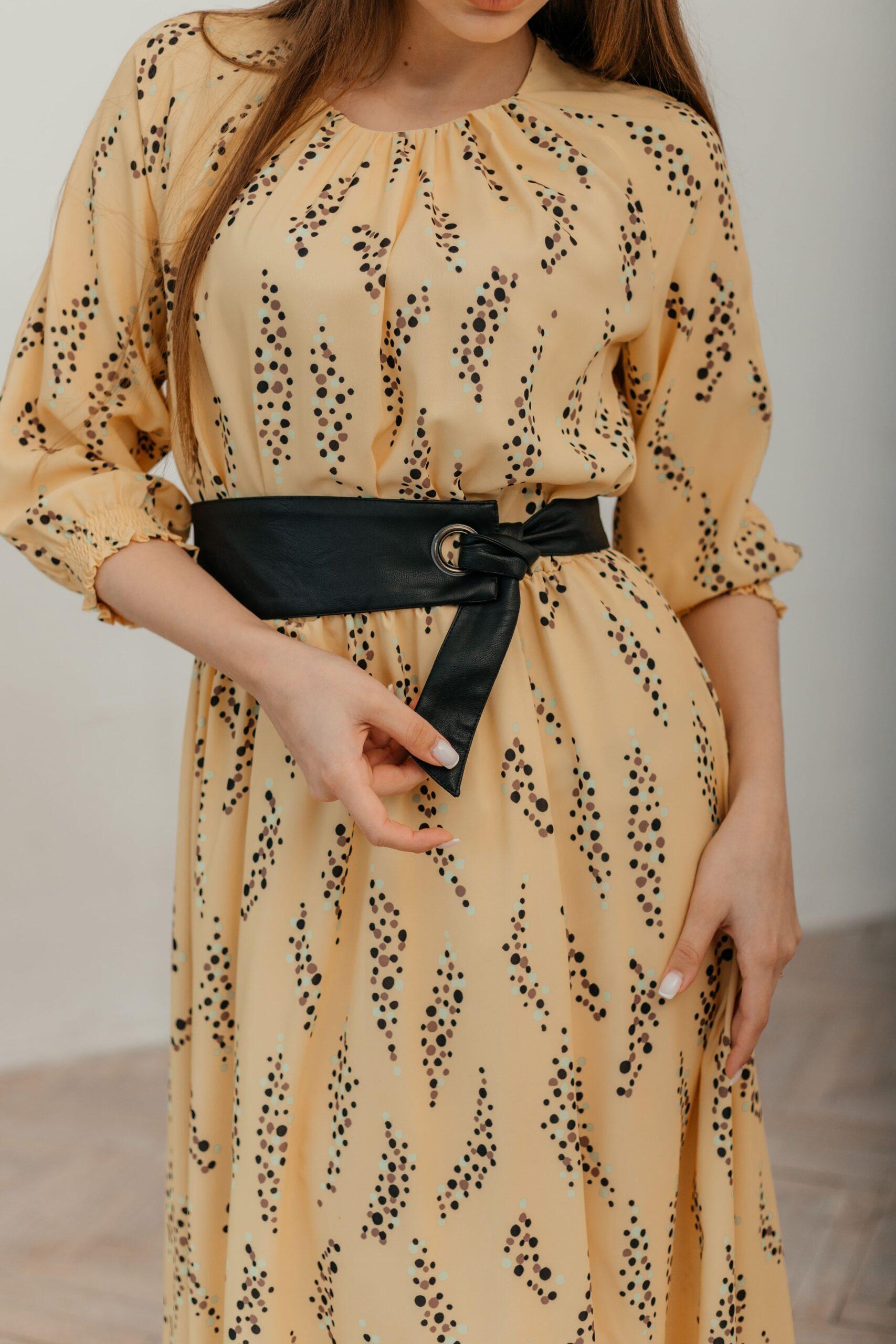Платье женское, длины миди с красивым разрезом слева. Рукав в модели четвертной , вырез неглубокий, круглый. С платьем идет широкий пояс из эко — кожи.