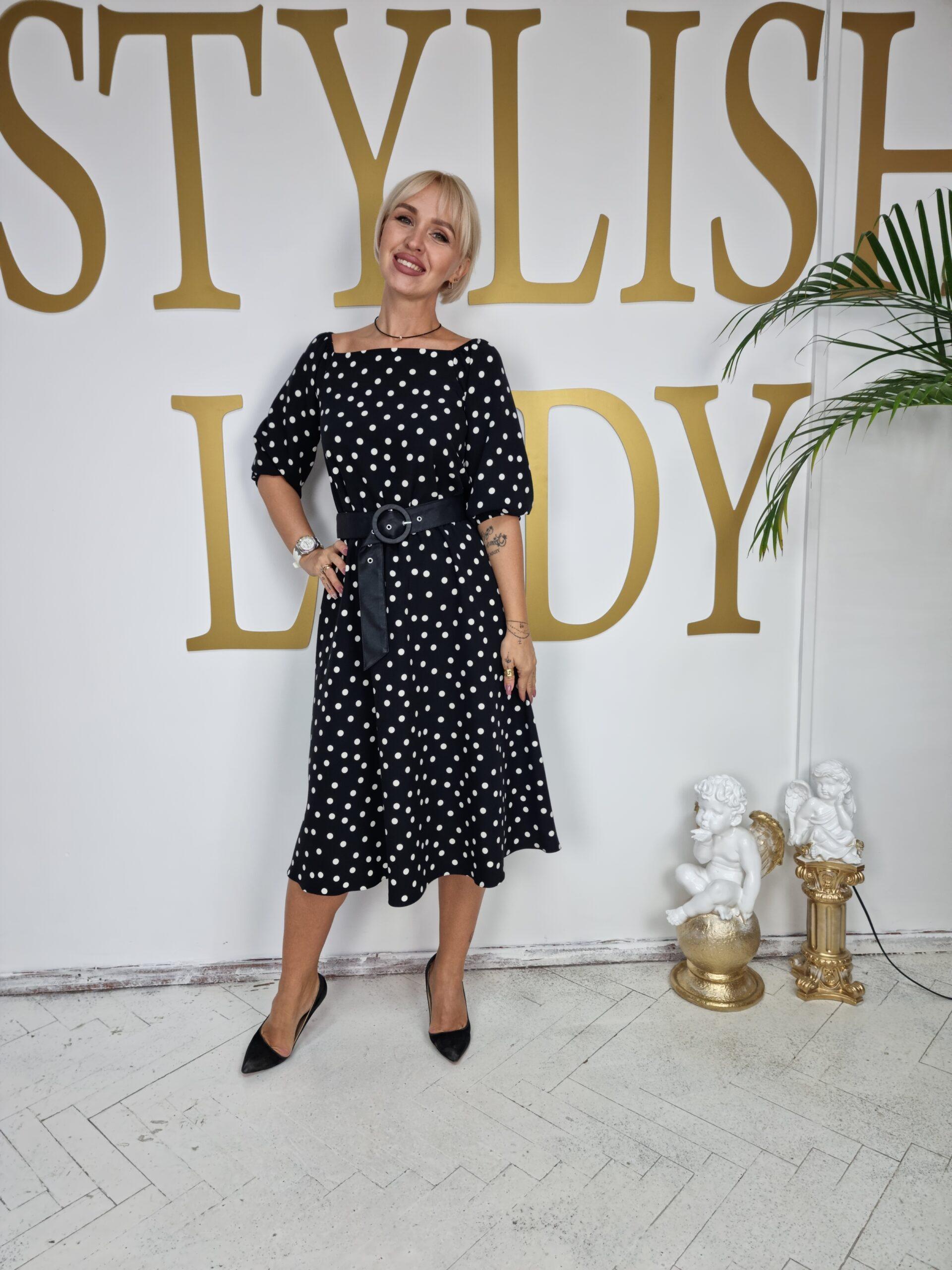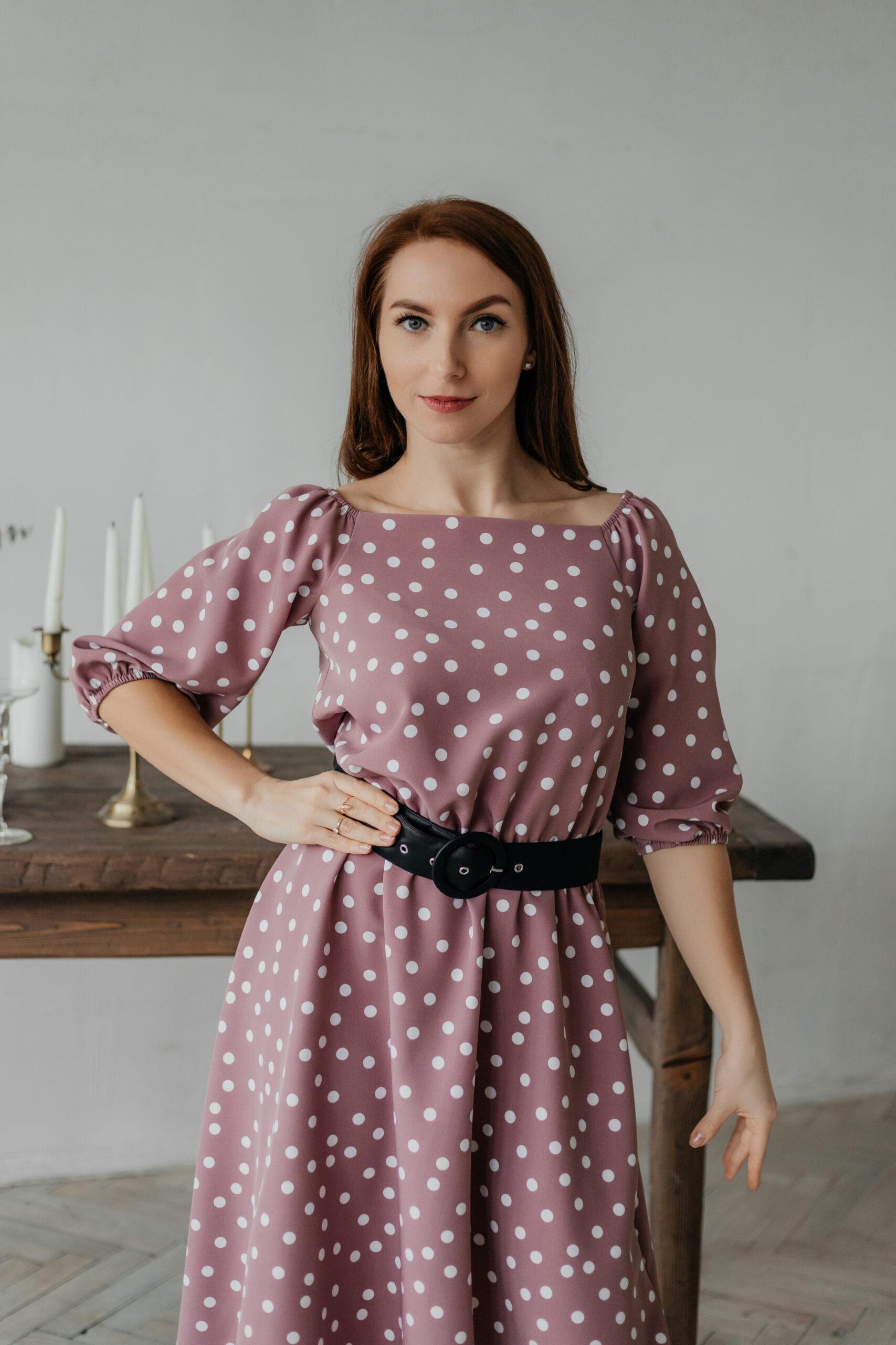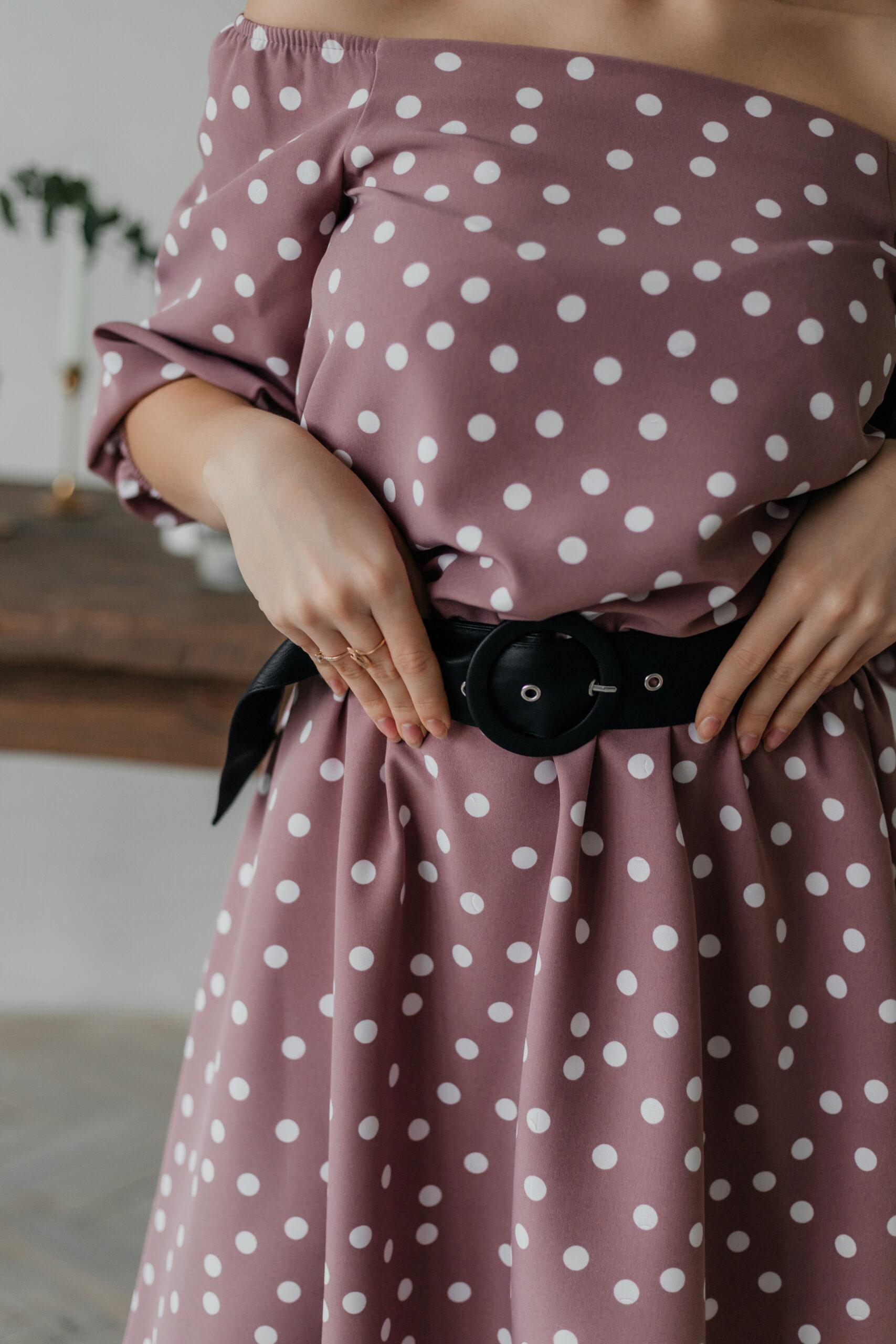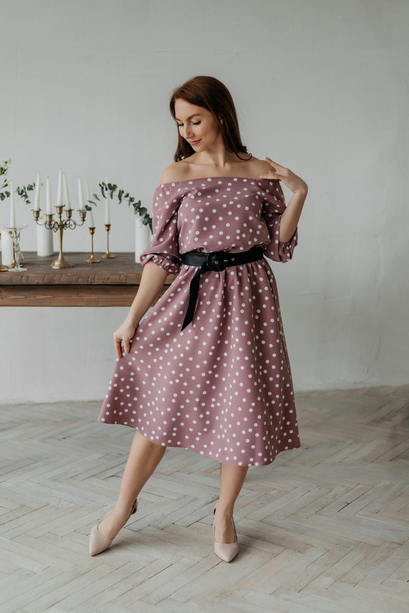 Платье женское, в длине миди ,приталенное. Рукав три четверти, снизу на резинке. Платье можно спустить с плеч за счет вставленной резинки в верх рукава. Талию подчеркивает пояс из эко кожи с пряжкой.