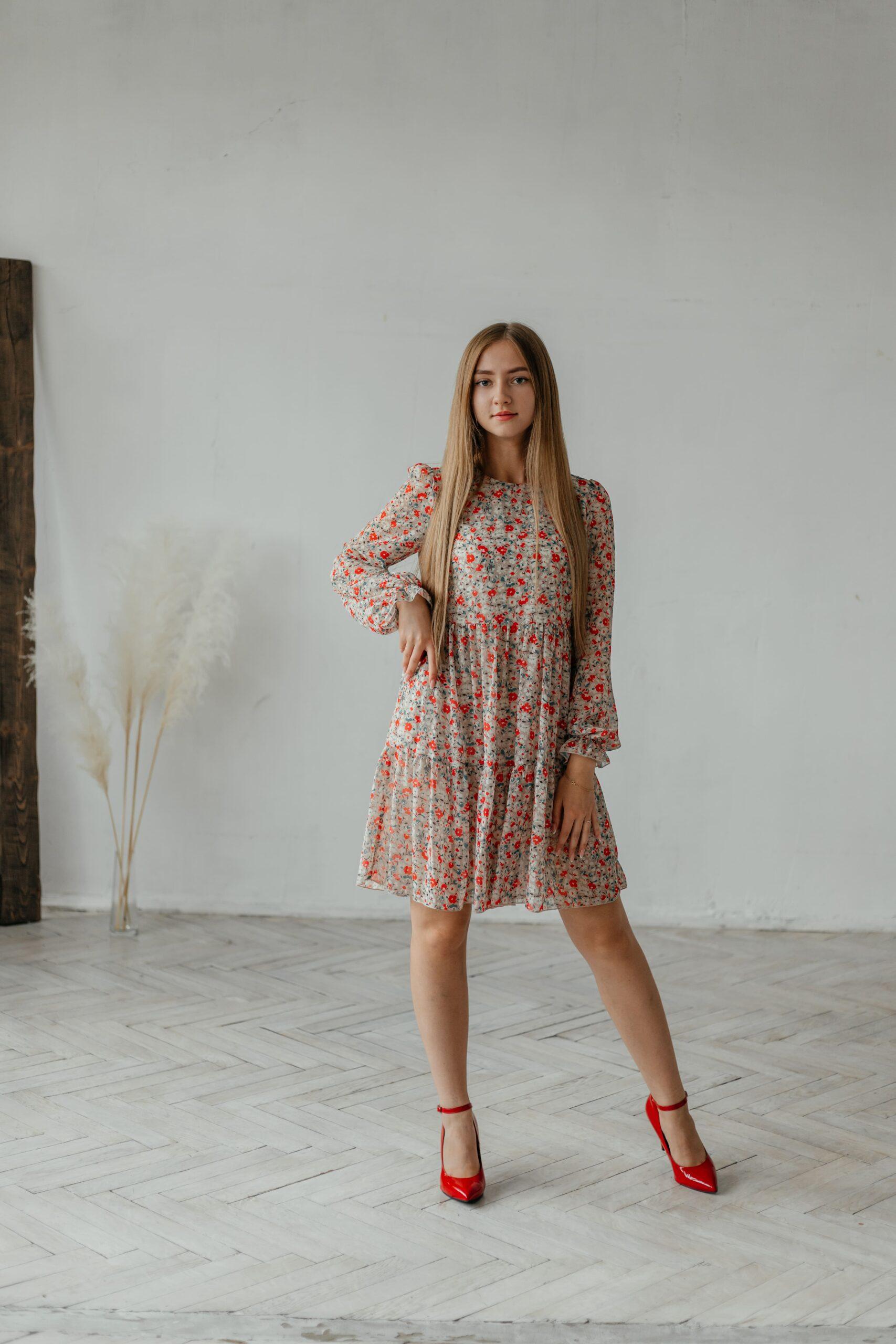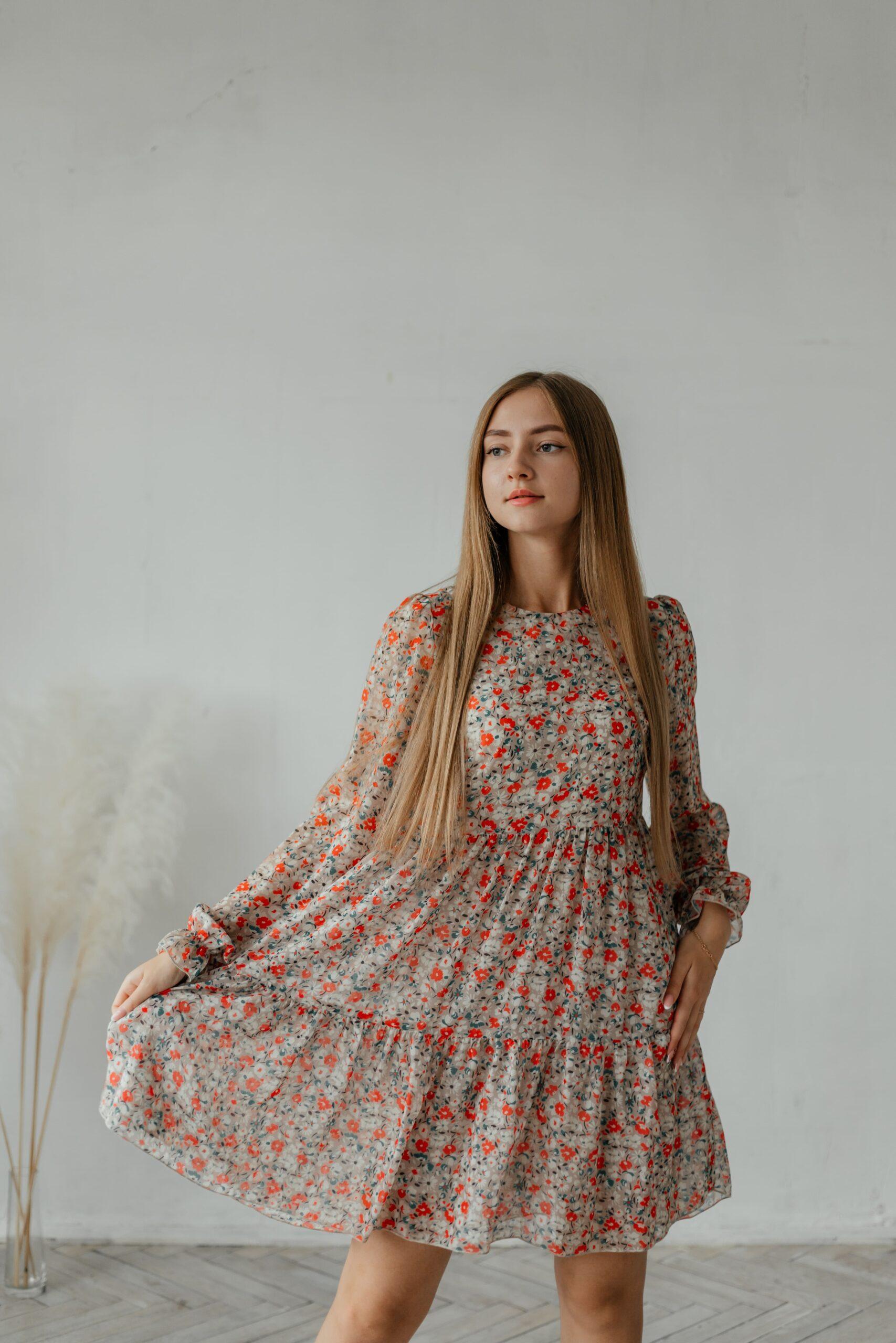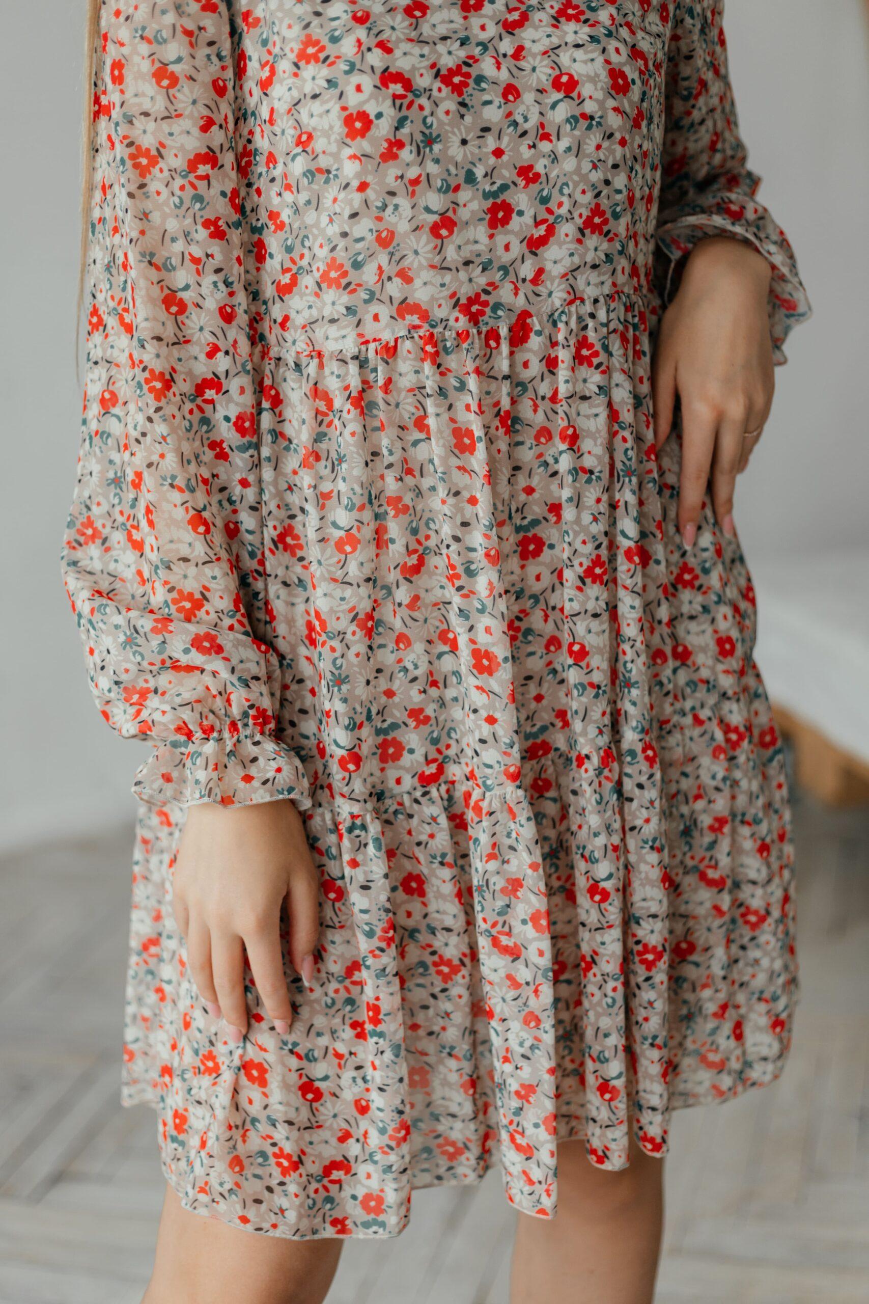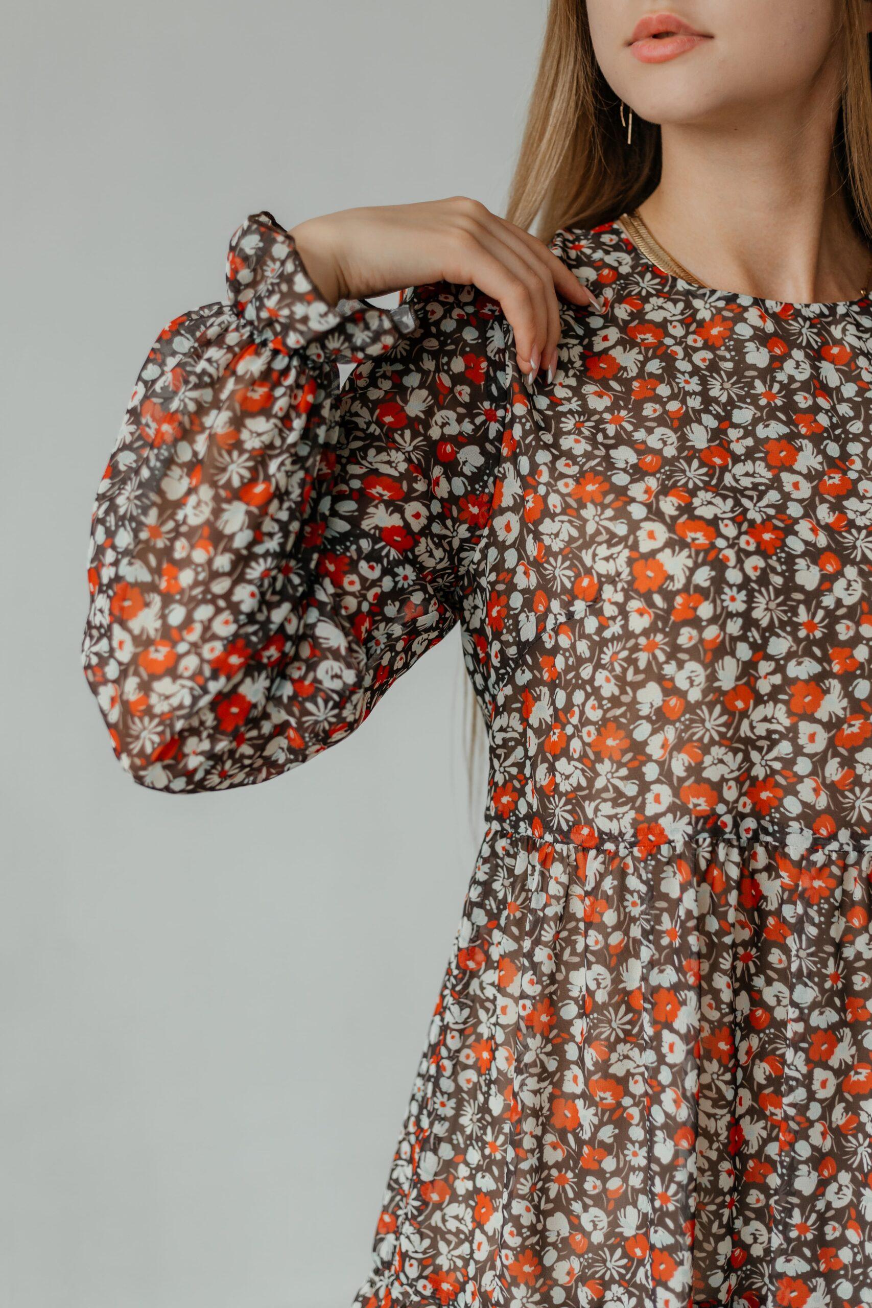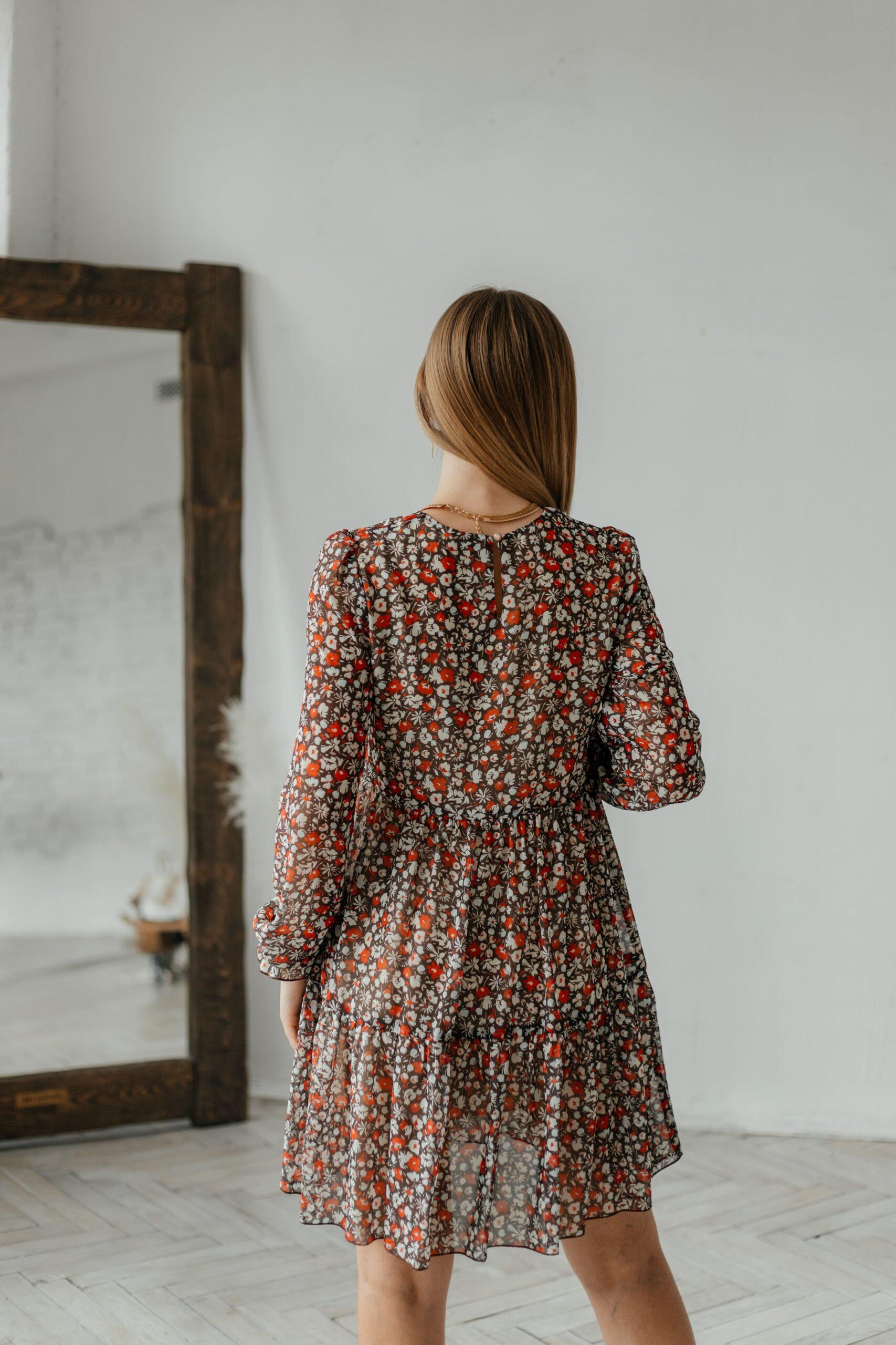 Платье женское , шифоновое, длины мини, с длинным рукавом, рукав снизу на резинке. В модели два волана и отрезная талия.