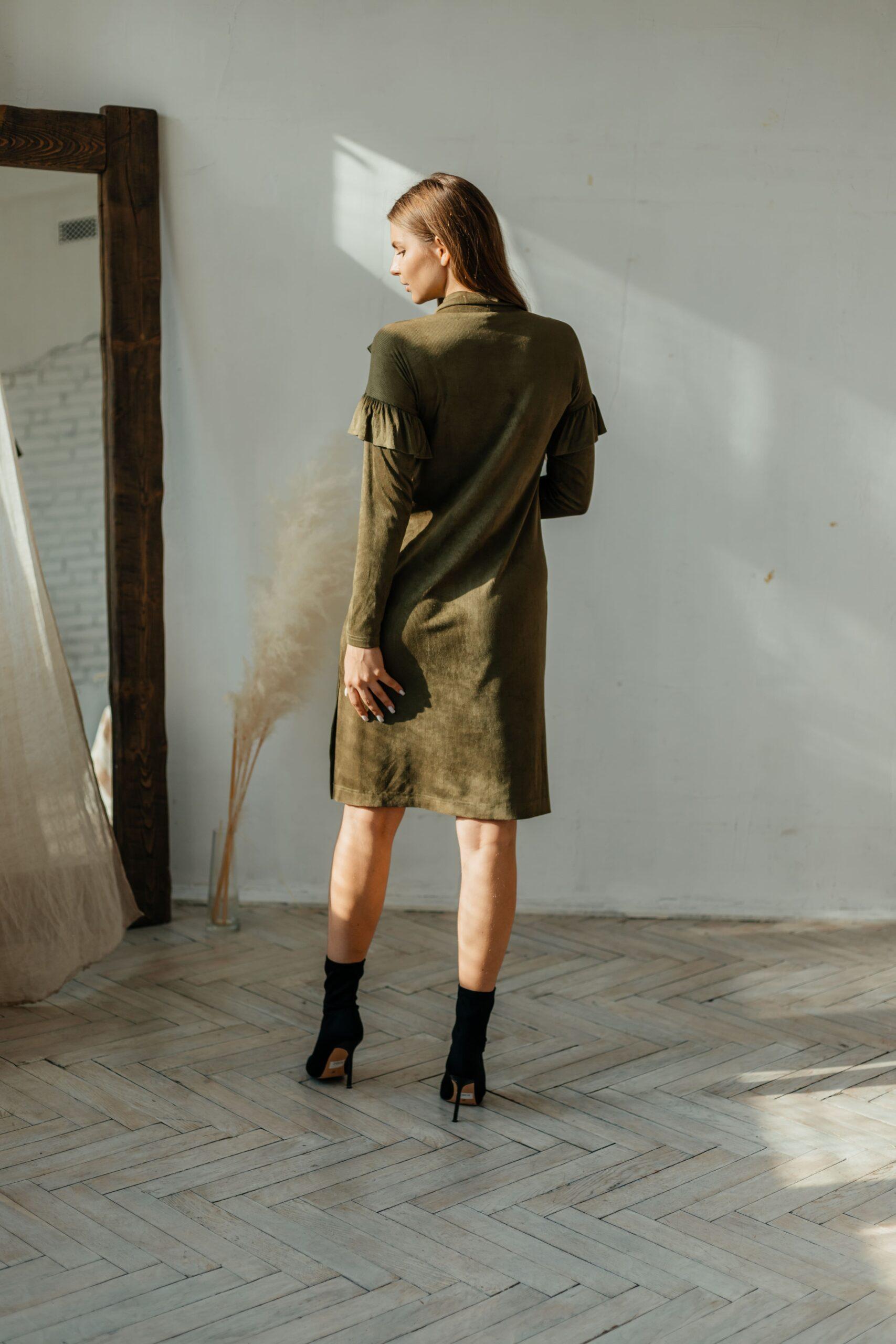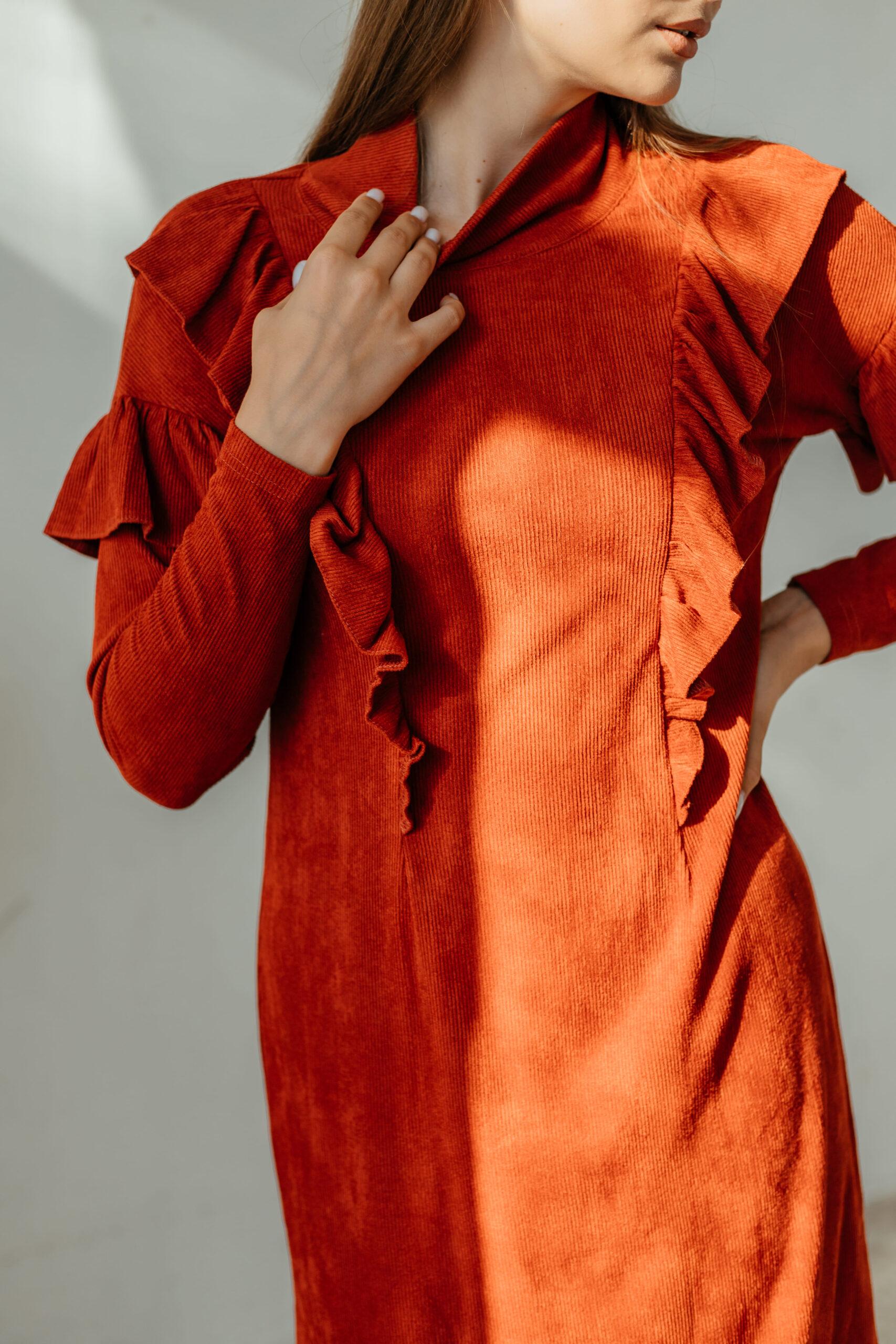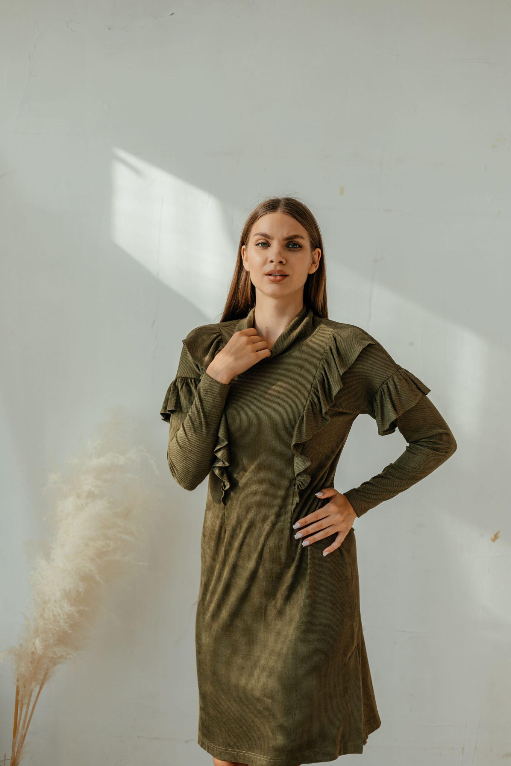 Платье женское, из мягкой штруксовой ткани с длинным рукавом в длине мини. На рукавах и спереди на платье воланы, горловина выполнена стойкой.