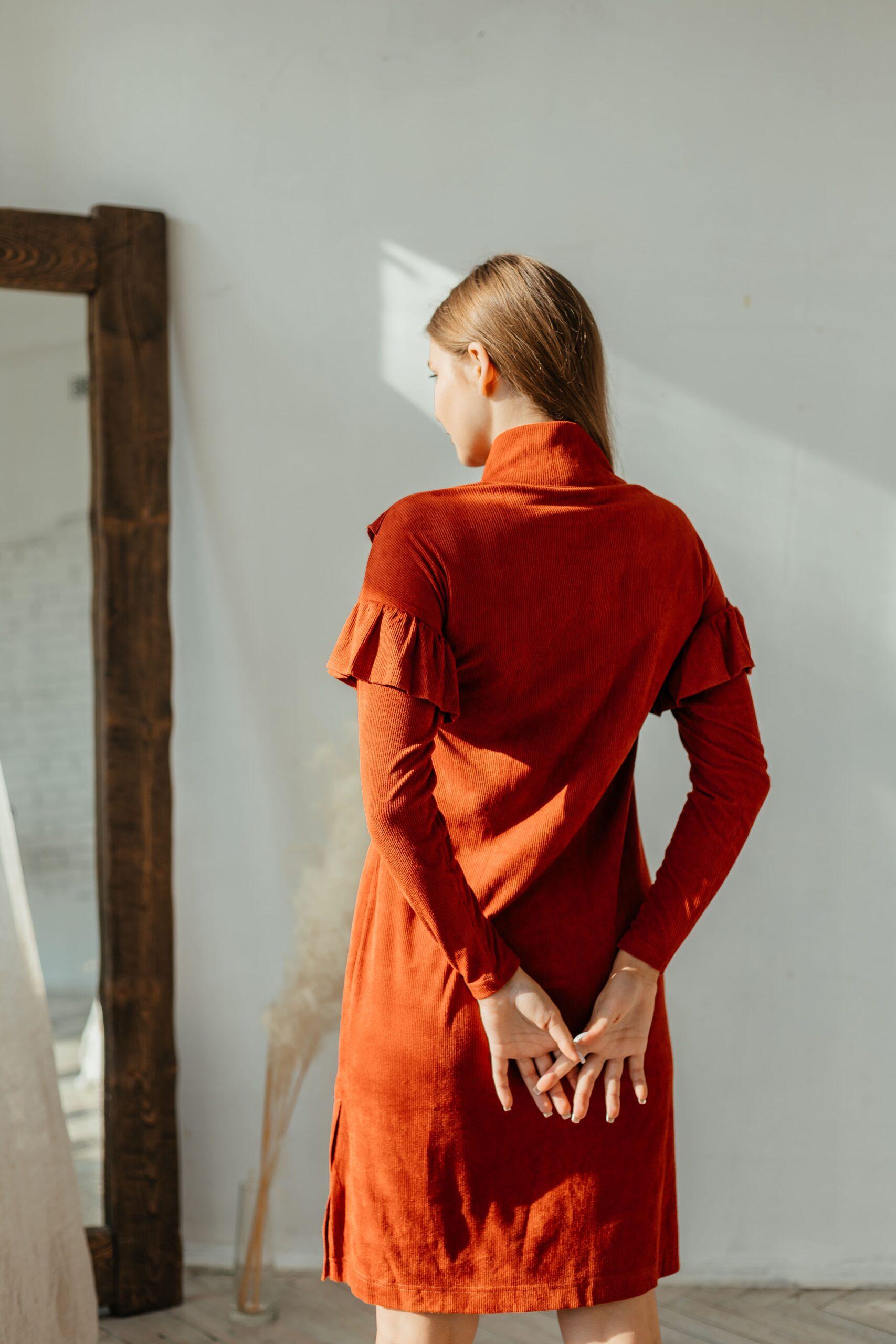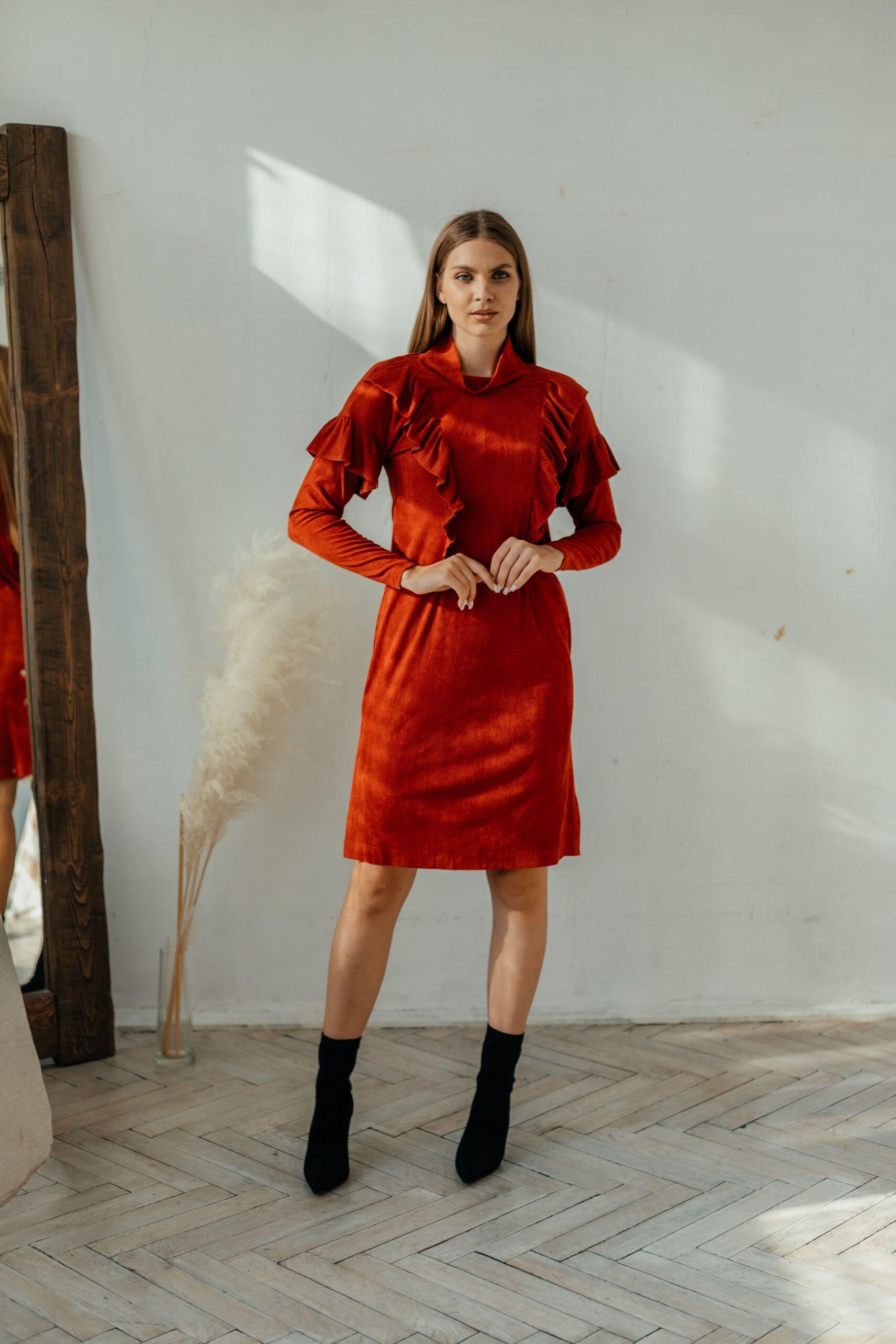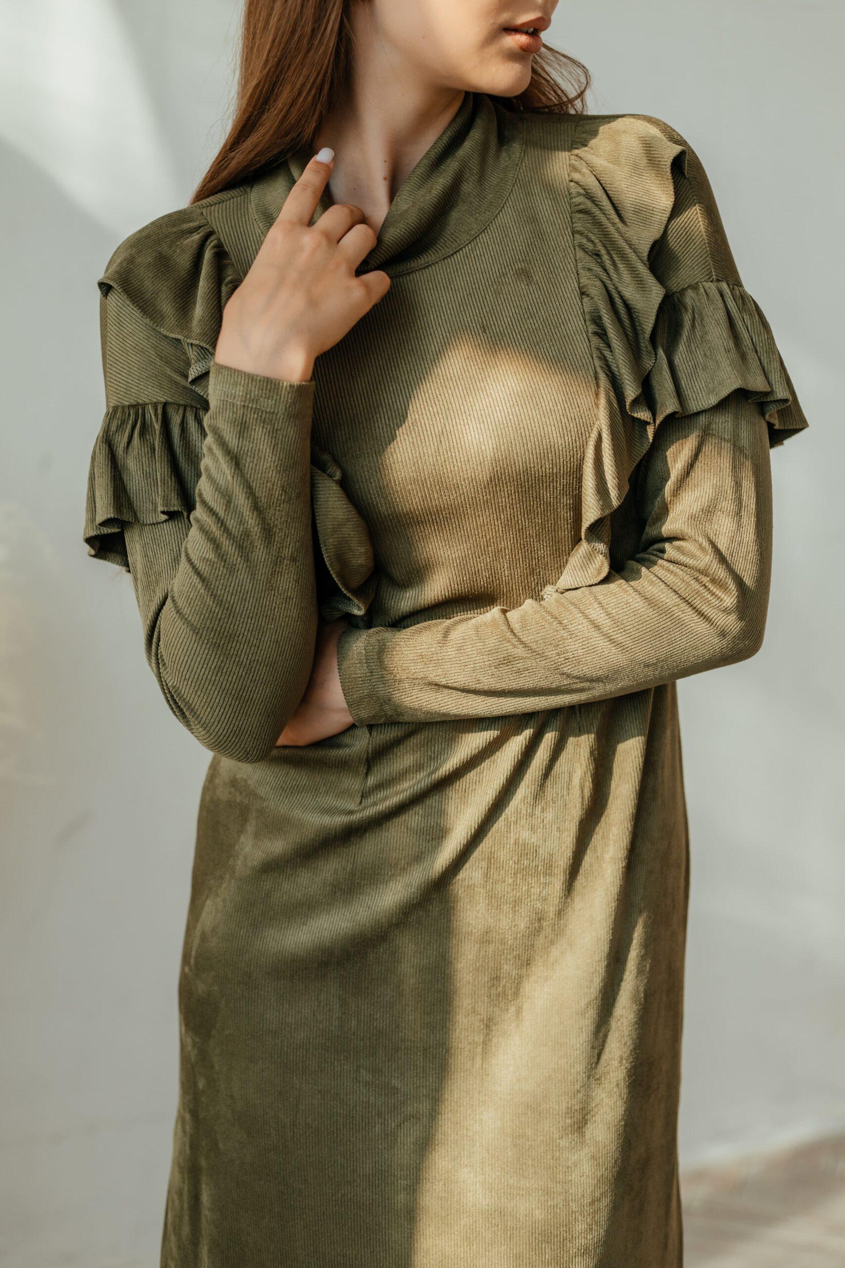 Платье женское, из мягкой штруксовой ткани с длинным рукавом в длине мини. На рукавах и спереди на платье воланы, горловина выполнена стойкой.