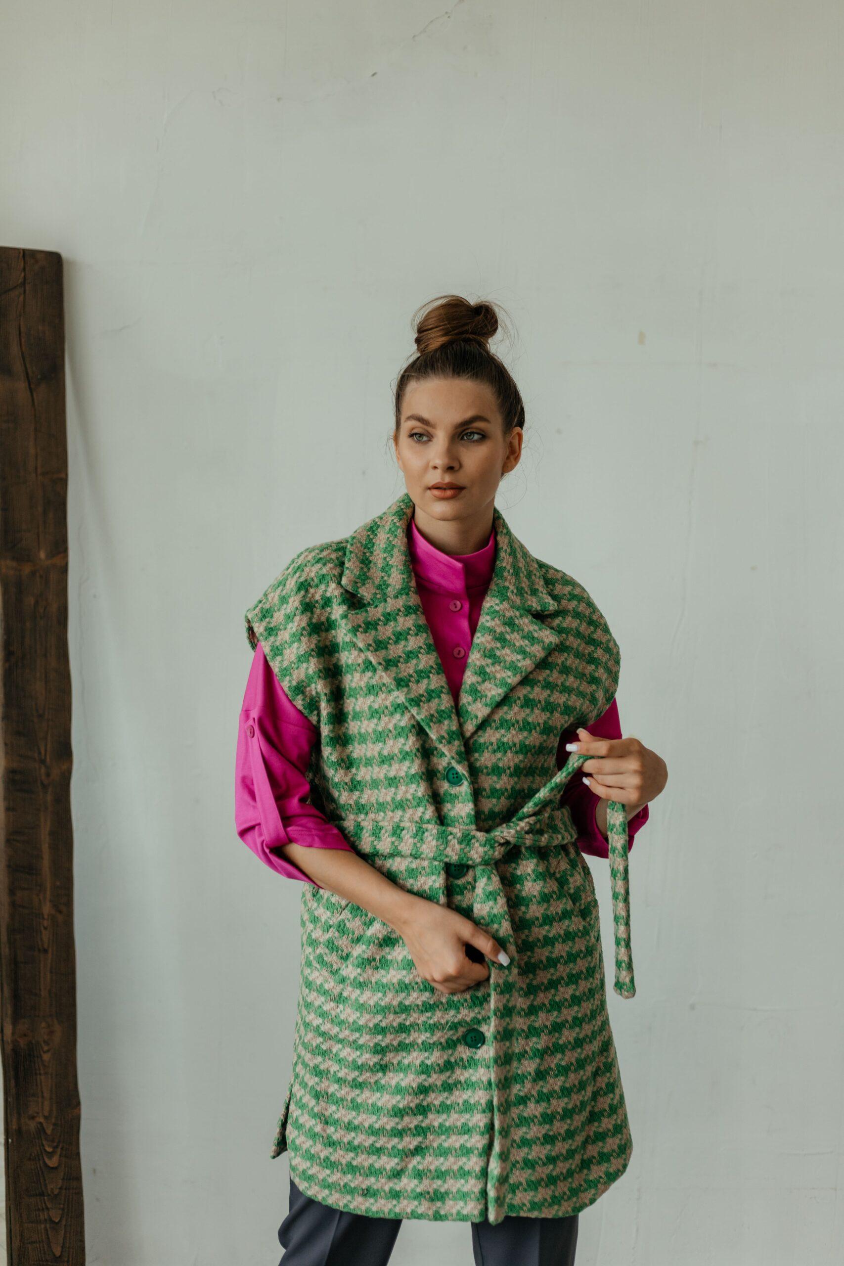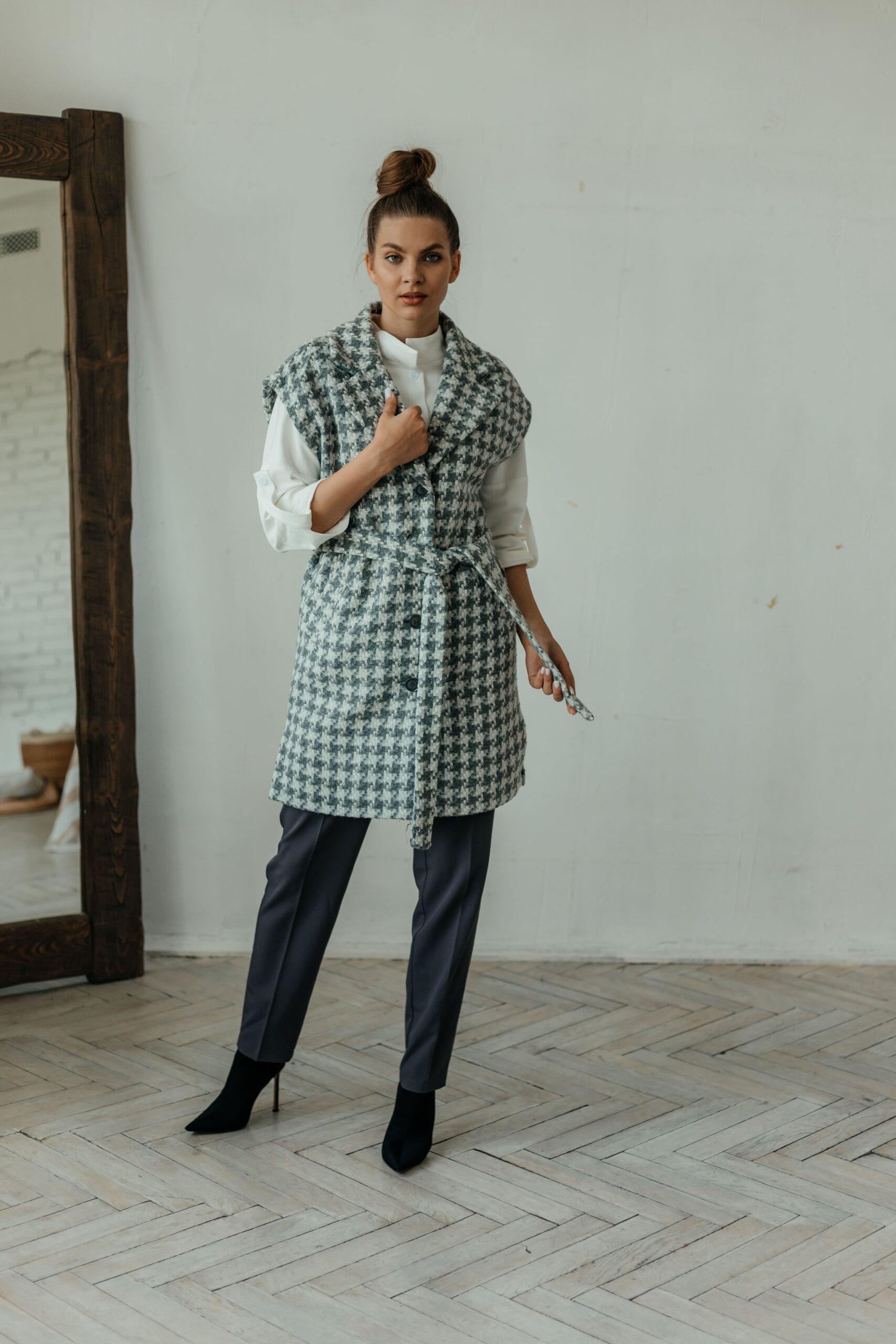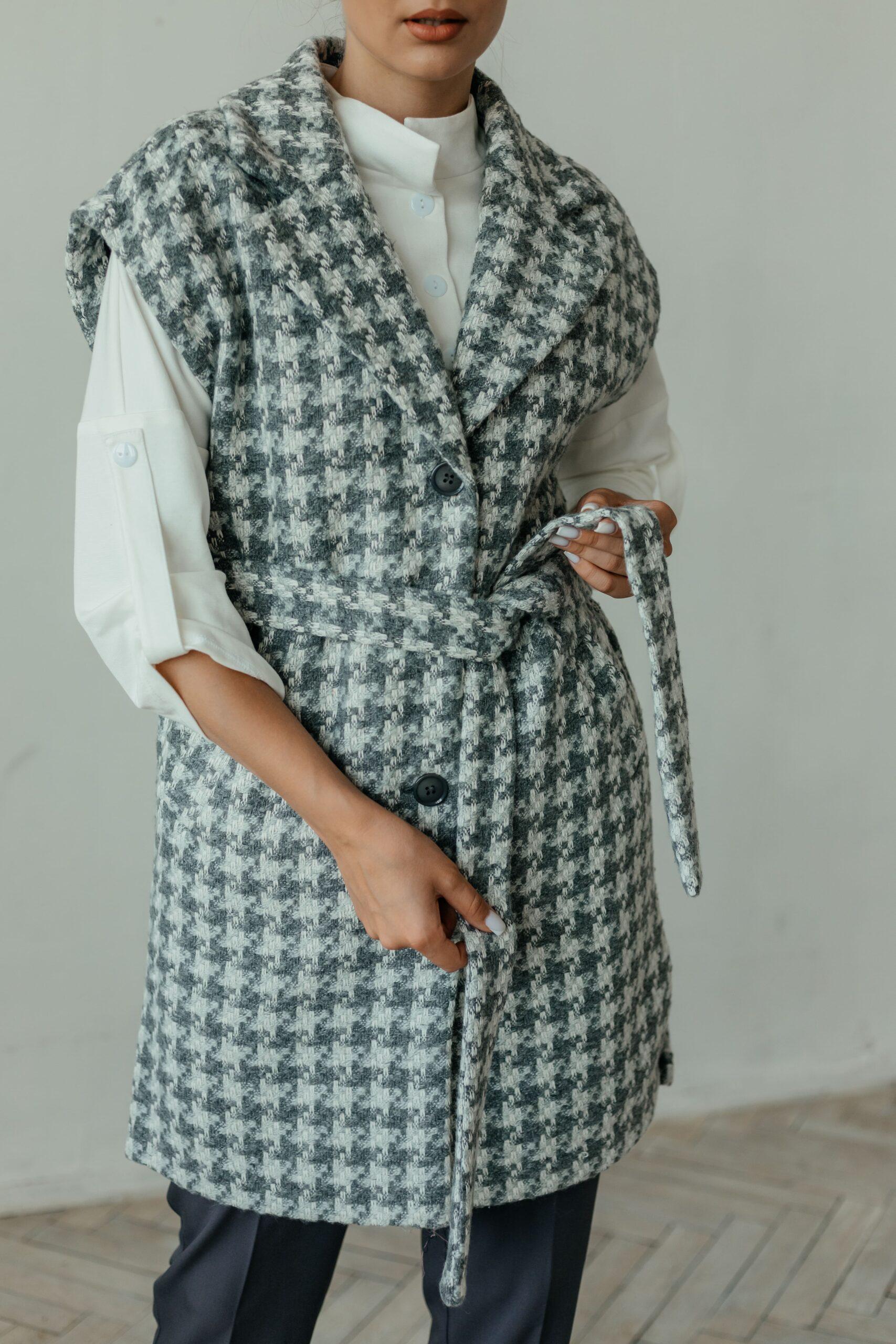 Жилет женский, без рукавов, удлиненный с разрезами по бокам, застегивается на четыре пуговицы. Жилет на тканевом поясе с карманами.