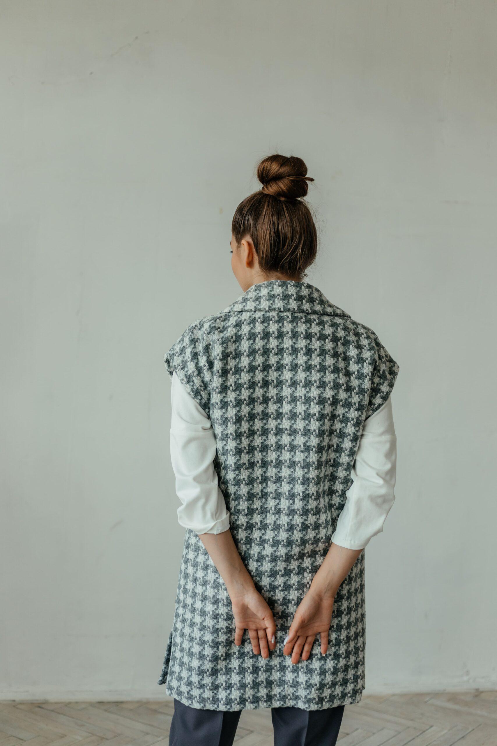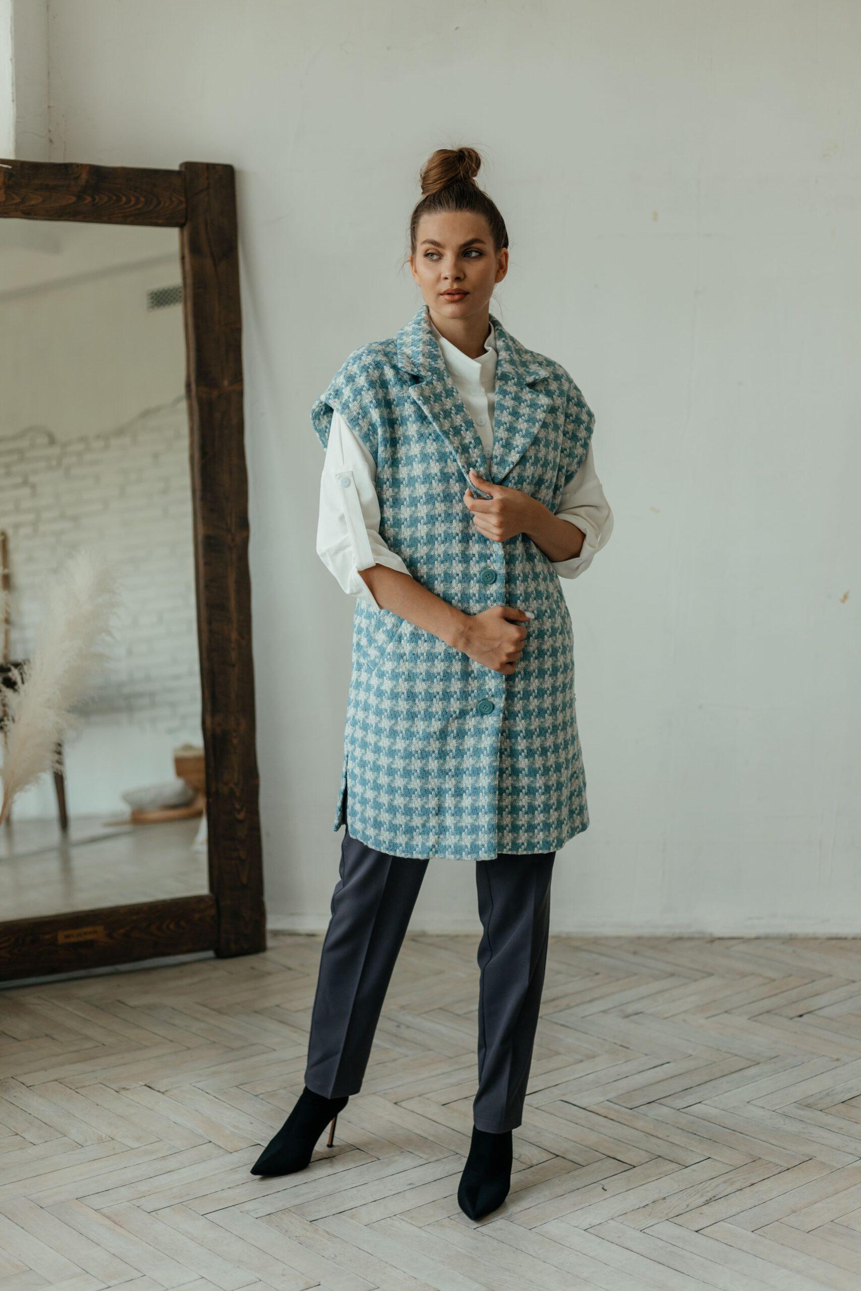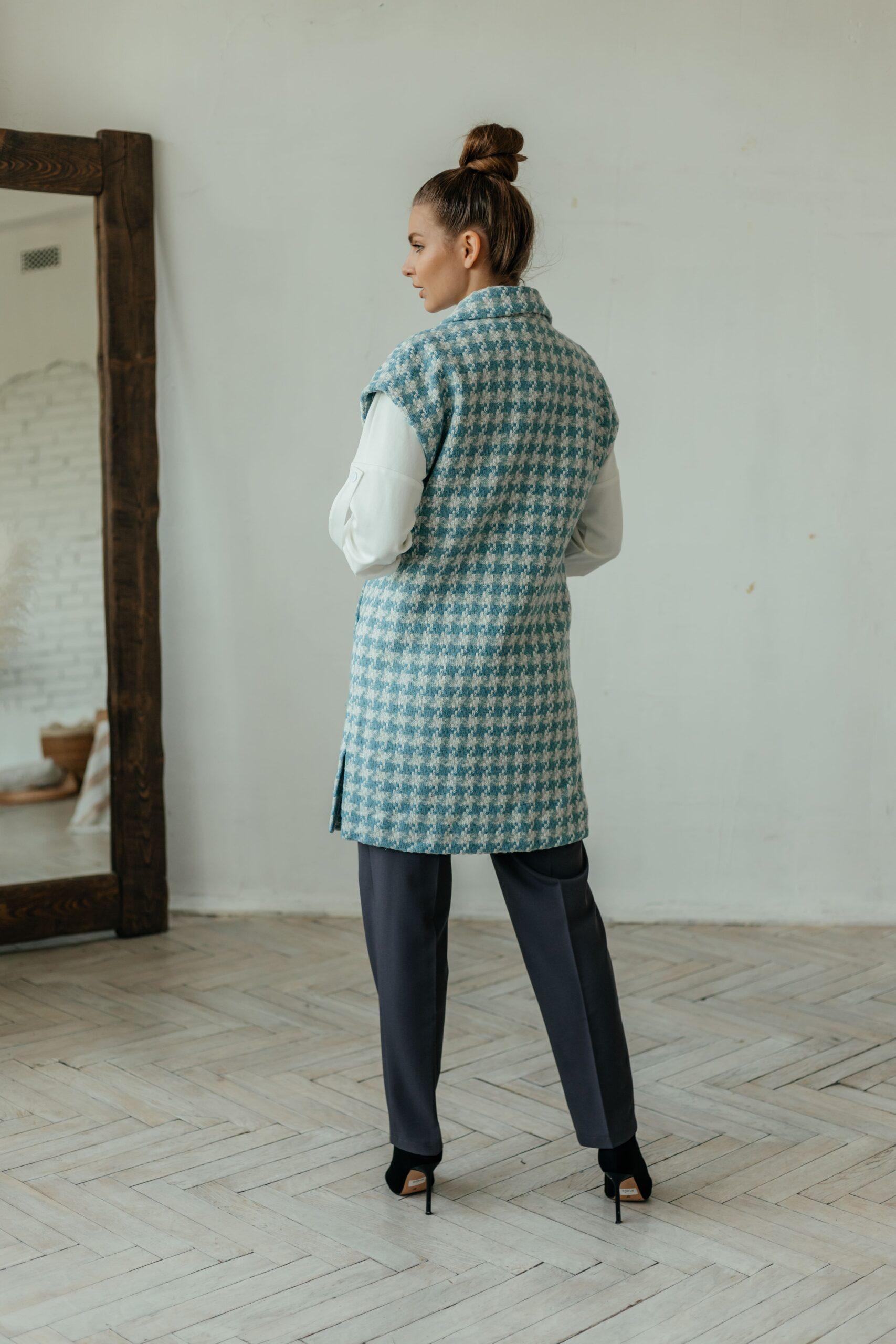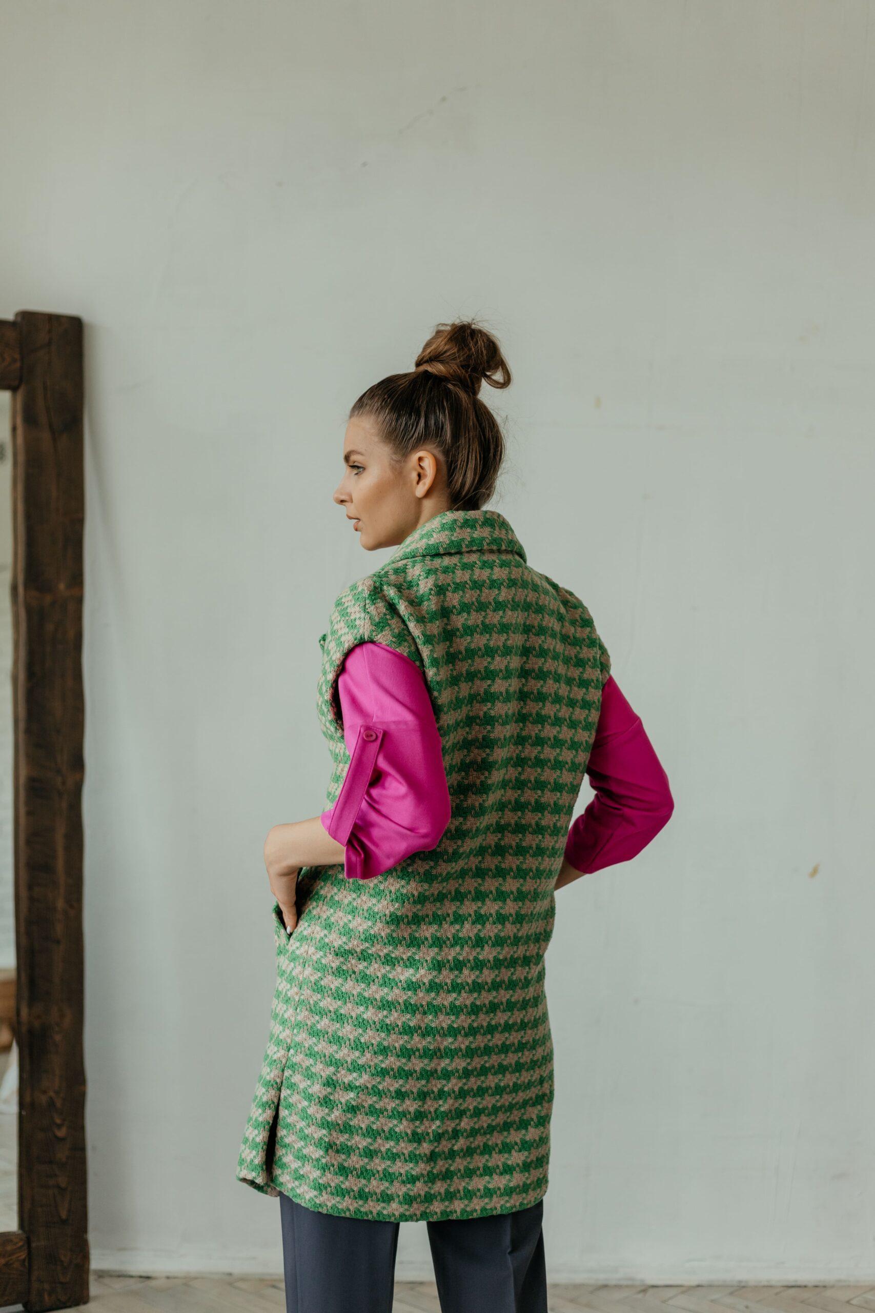 Жилет женский, без рукавов, удлиненный с разрезами по бокам, застегивается на четыре пуговицы. Жилет на тканевом поясе с карманами.